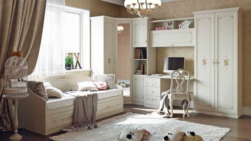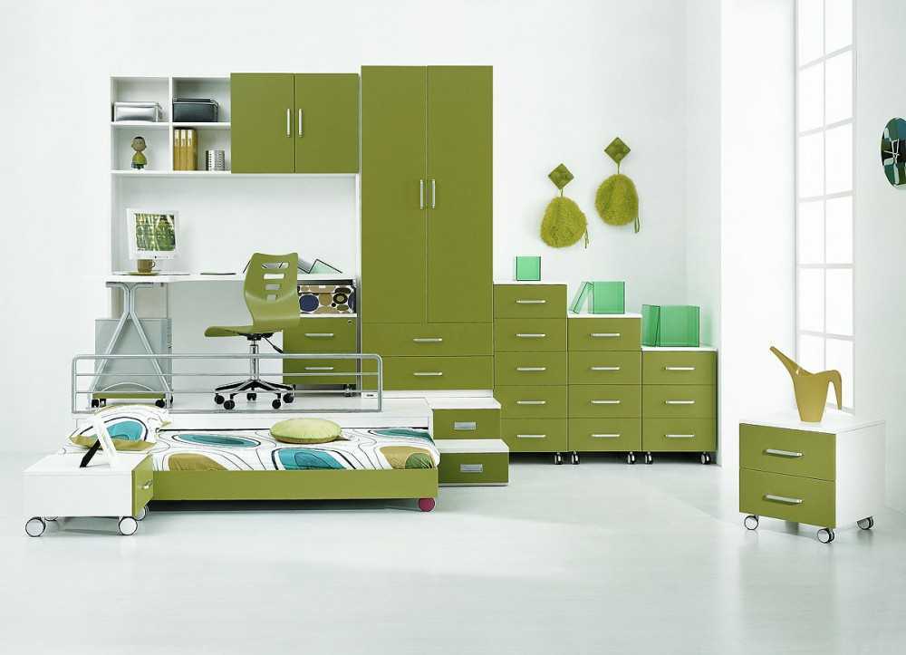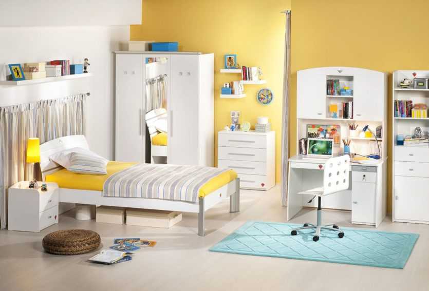 кровать, письменный стол, шкаф и комод. Если комната не совсем маленькая, то