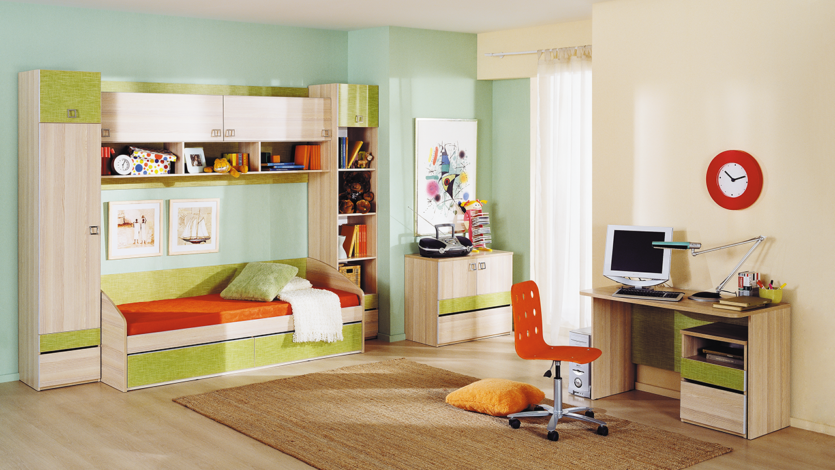 Столешница и стул в идеале имеют регулировку по росту, т.к. их хозяева будут быстро расти. Длина кровати тоже рассчитывается с запасом: если в будущем не будет возможности её расширить, лучше не брать встраиваемый тип, а ограничиться отдельно стоящей кроватью и стенкой для работы и хранения.