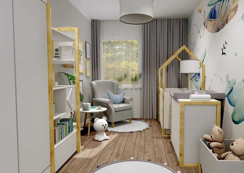 - Мебель должна быть из натуральной древесины или окрашена. Подойдет кровать-трансформер, которая «растет» вместе с ребенком, светлые полки, шкафы.