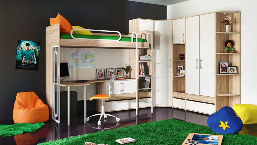 Мебель для подростков. В наборе присутствует просторное спальное место, письменный стол, большой шкаф и шведская стенка.