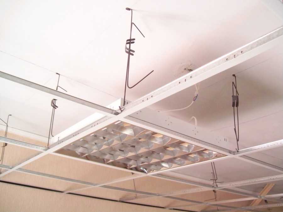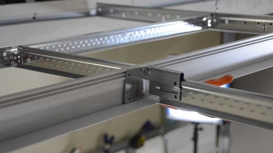 Профили играют роль направляющих. Именно на них приходится основная нагрузка. Вес всей потолочной конструкции незначителен, поэтому при укладке профилей выдерживается шаг, равный 1,2 м.