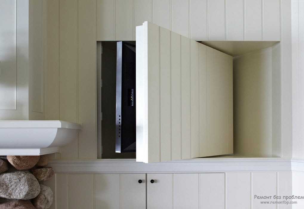 Телевизор можно спрятать за картинами, раздвижными панелями, дверьми шкафов-купе.