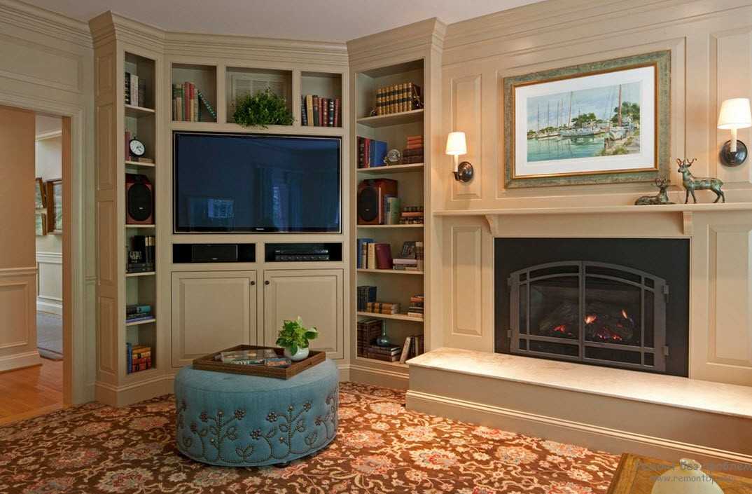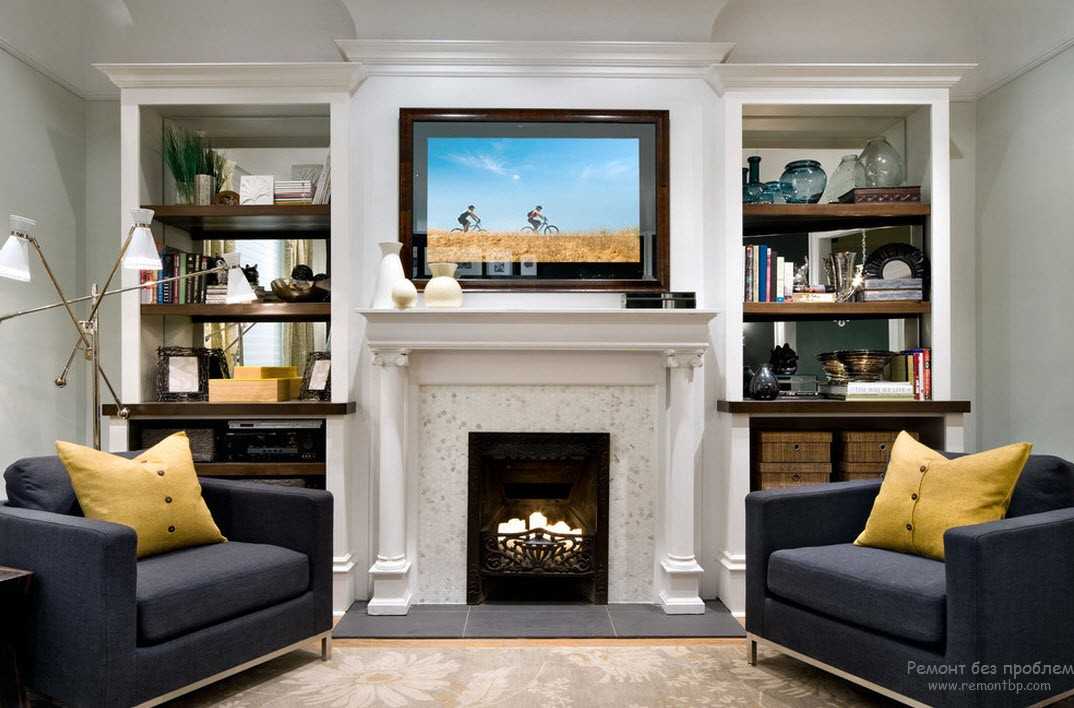 Экран, вмонтированный в мебель – прекрасная идея сделать комнату не только комфортным местом для увлекательного отдыха, но и функциональной зоной. Так, например, телевизор можно поместить среди книжных полок. При таком подходе даже объемный монитор станет второстепенным акцентом в интерьере. Это отличное решение для любителей классического стиля, когда больше хочется, чтобы центральным местом в гостиной был тот самый камин.