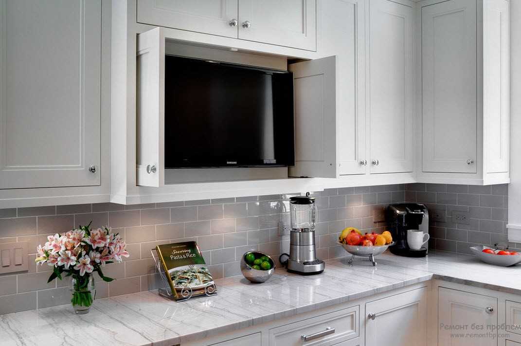 Есть много маленьких откидных телевизоров, которые работают на кухнях. Это те же самые приборы, которые вы можете установить в автомобили, и которые предназначены для переворачивания вниз в положение просмотра. Единственная серьезная проблема с этими полезными маленькими телевизорами заключается в том, что сама конструктивная особенность, которая делает их такими сдержанными, и не позволяет им быть достаточно большими, чтобы действительно наслаждаться просмотром фильмов или программ.