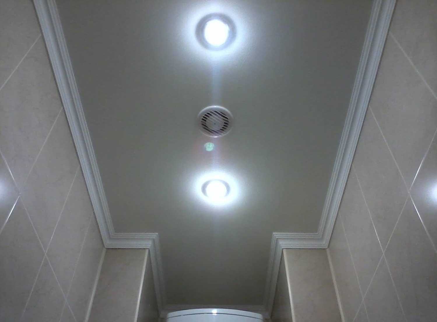Также отличным материалом для санузла считается натяжной потолок из ПВХ. С его помощью удается зрительно увеличить пространство. Кроме того, данный материал не боится повышенной влажности.