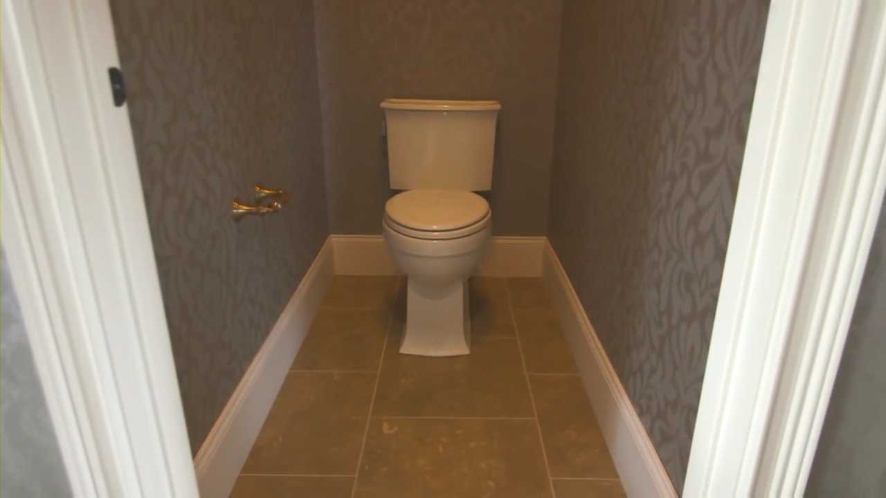 На фото слева отделка туалета в современном стиле, на фото справа интерьер санузла выполнен в классическом стиле, над бордюром оборудован люк для доступа к коммуникациям.