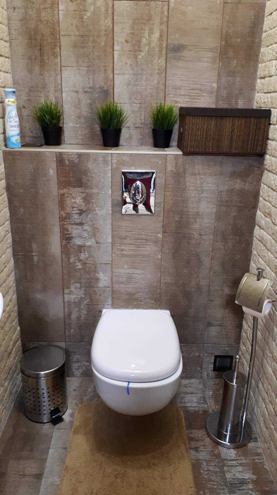 На фото справа туалет в стиле ретро. Настенный кафель под дерево гармонично сочетается с коричневой крышкой унитаза.