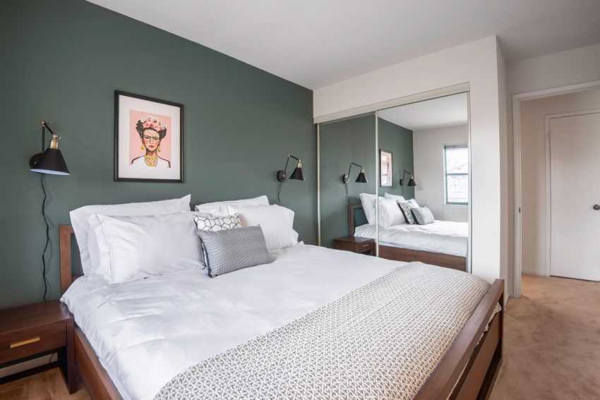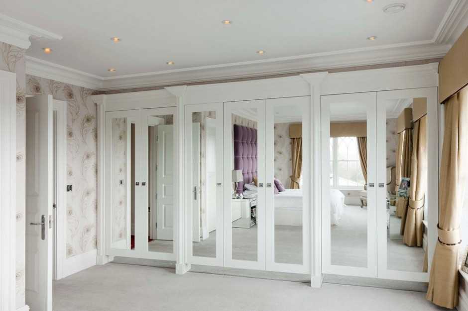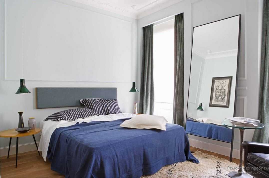 Если необходимо повесить в спальне большое зеркало, тогда можно прибегнуть к нескольким вариантам его размещения. Самым простым и экономным решением будет покупка шкафа-купе с удобными зеркальными дверцами во весь рост. В итоге, обитатели комнаты сохранят ценное пространство и зрительно расширят пространство спальни.