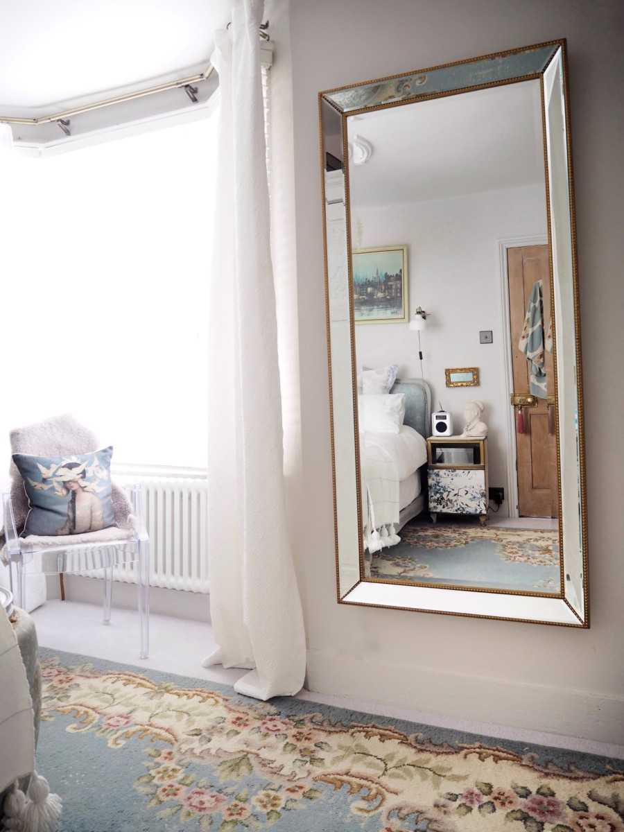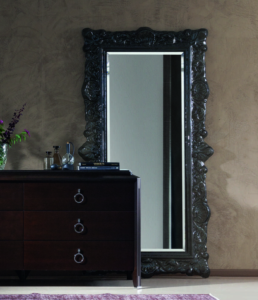 Стильным решением будет размещение зеркала на полу. Однако для напольного изделия потребуется большая рама, которая позволит избежать неприятного эффекта отображения пола. Лучше всего эту конструкцию поставить в гардеробной или же на свободной стене в максимальном отдалении от кровати.