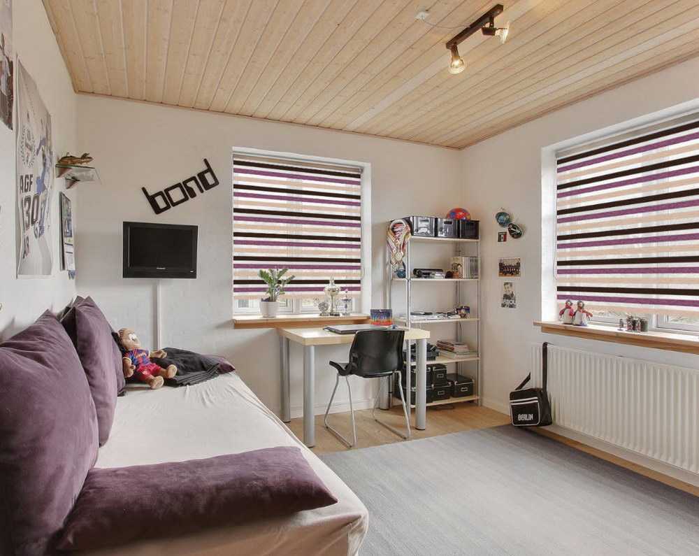 - На узкие окна практичнее всего вешать горизонтальные жалюзи с разноцветными или окрашенными в цвет стен ламелями.