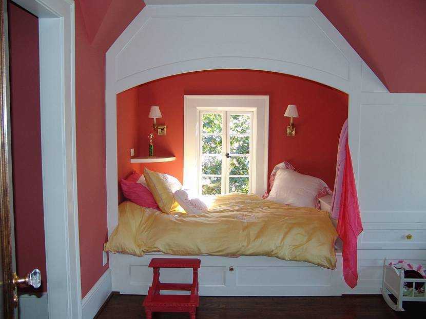 Спальня для девочек-близняшек всегда имеет ряд тонкостей, которые приходится решать. Оригинальным решением будет вмонтировать две рядом расположенные кровати в стену. Оформляются эти проемы в виде домиков с наличием декора внутри. Вместо последнего часто оставляют проем, чтобы девчонки могли перешептываться друг с другом.