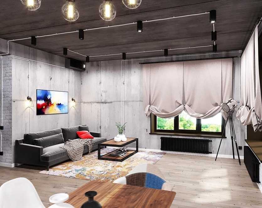 Например, как оформить очень высокие окна на серой бетонной поверхности стены. На этом фоне можно подумать о применении мягкого текстиля и натурального дерева которые станут центром всего домашнего уюта.