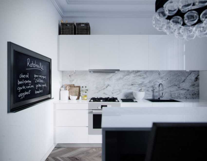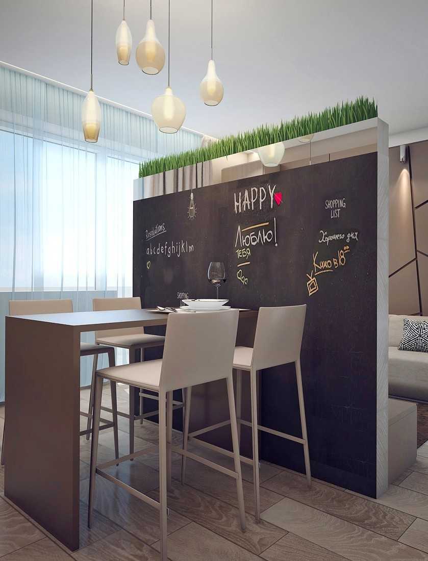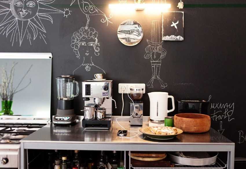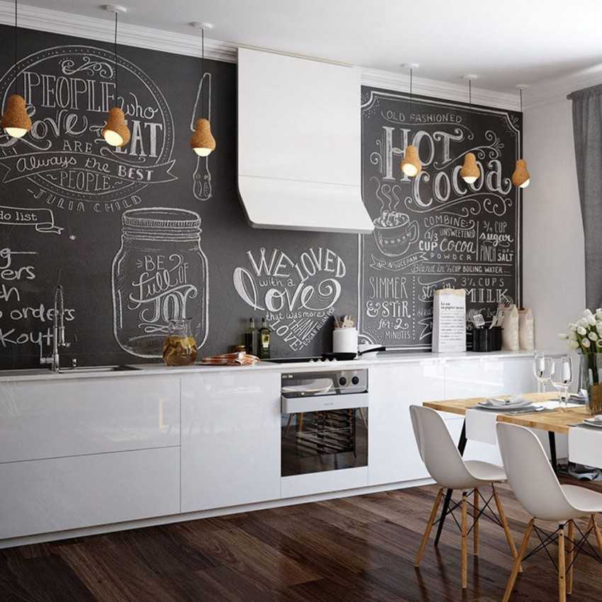 Грифельная доска поможет достаточно практично занять стенное пространство, при этом не займет лишнего места. При желании ее можно просто разукрасить, и дизайн интерьера кухни заиграет по-новому. Доску можно использовать как отделку для стенного пространства, ведь у нее много декоративных и функциональных преимуществ.