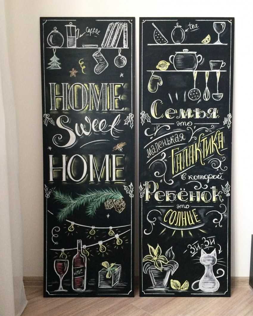 Чтобы сделать стильный интерьер вашей квартиры вам нужна меловая доска. А уже с её помощью вы создаёте потрясающие картины на любой вкус. Кроме того, с каждой новой картиной или какими-то надписями, ваш интерьер меняется. И если вы хотите произвести впечатления на своих друзей и семью, вы сможете это сделать с вашими фантазиями на доске для рисования мелом.