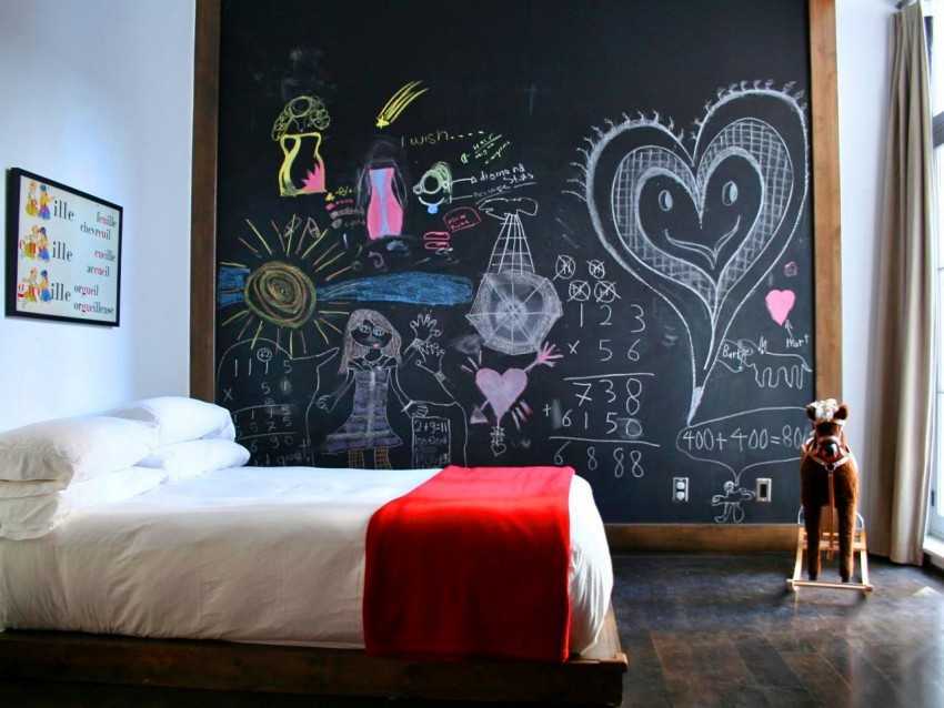 Строгих ограничений того, где она может использоваться, нет. Единственным условием, способным повлиять на её установку, является совместимость с интерьером, стилем оформления помещения. Кроме того, не обязательно делать её черной, она может быть любой, на ваше усмотрение. Главное – подобрать цвет заметных на её поверхности мелков.