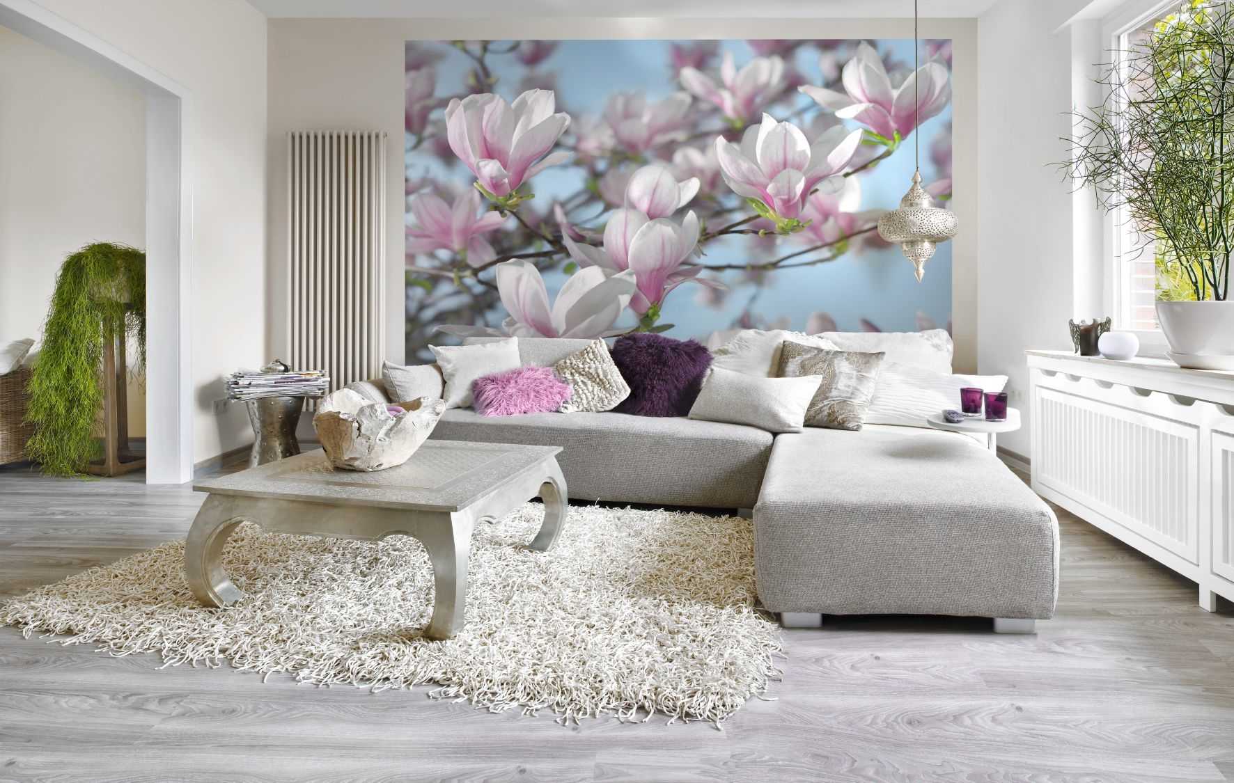Прочные фотообои на флизелиновой основе достаточно долговечны и экологичны. На них хорошо смотрятся светлые сюжеты, легкие картины, а также имитация акварельной живописи. Основным преимуществом подобных покрытий называют простоту наклейки, поэтому их нередко выбирают для самостоятельной отделки гостиной.