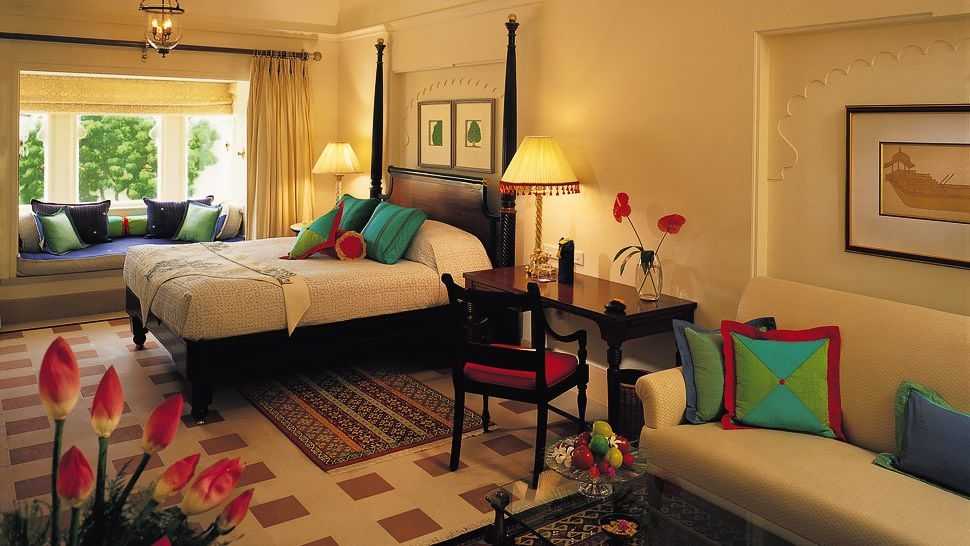 Изобилие декора в виде керамики, настольных и напольных ваз, перьев экзотических птиц, фигурок из слоновой кости, камня и дерева с инкрустацией превращает комнату в подобие сказочного дворца махараджи.