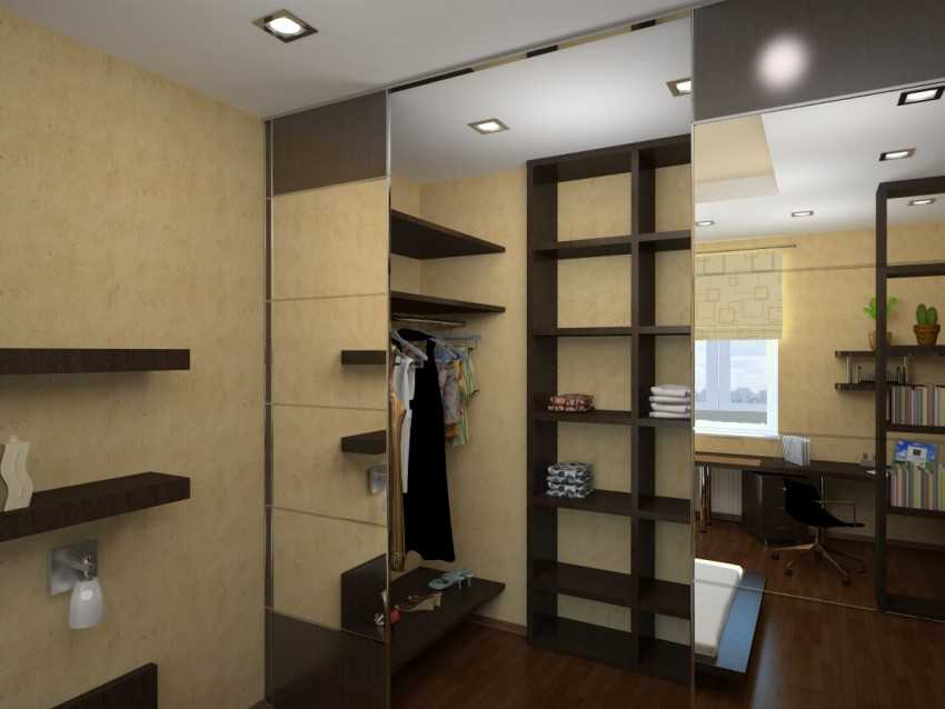 Гардеробная из кладовки по возможности дополняется одним или несколькими зеркалами. Они позволяют рассмотреть выбранный образ в разных ракурсах, визуально увеличивают помещение. Удобны и привлекательны дверцы, оборудованные отражающими поверхностями.