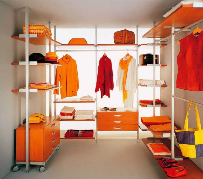 В брежневке размеры позволяют оформить полноценную комнату с различными типами стеллажей, навесными штангами, ростовыми зеркалами.