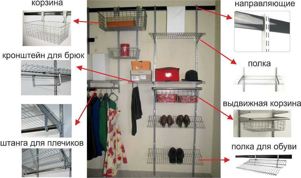 Верхний участок оснащают антресолями, штангами и настенными крючками. Данная часть подходит для верхней одежды и редко используемых вещей и аксессуаров в виде новогодних игрушек.