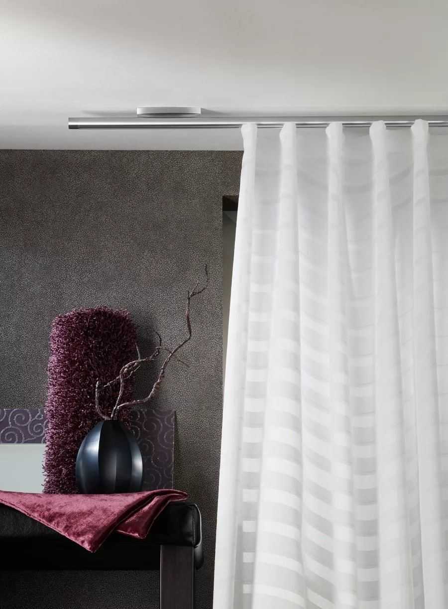Неоспоримым преимуществом настенных карнизов для штор является их функция в качестве декорирования пространства вокруг окна. Они будут работать как постоянный элемент в таком расположении окон, в котором шторы имеют значительный вес и сложные композиции. Помните, однако, что не каждое окно может быть оснащено настенными карнизами для штор. Для больших застекленных поверхностей потребуется другое решение, а именно потолочная направляющая. У рельсов есть свойство, что они могут быть объединены в длинные конструкции в несколько метров и изогнуты под прямым углом. Такое решение прекрасно работает в больших офисных помещениях, где необходимо закрыть окна. Недостатком потолочных карнизов является ограничение веса используемых материалов. Это должны быть легкие ткани, иначе рельсы не будут выполнять свою функцию. Преимущество в том, что они могут быть спрятаны и использованы везде, где небезразлично влияние света и оптическое увеличение помещения. Рельсы станут идеальным решением в том случае, если материалы, из которых сделаны стены, могут не выдержать вес традиционного карниза.