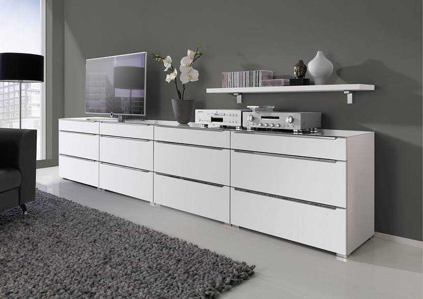 Поставив рядом три тумбы, можно организовать удобную систему хранения для гостинойИсточник dobrzemieszkaj.pl