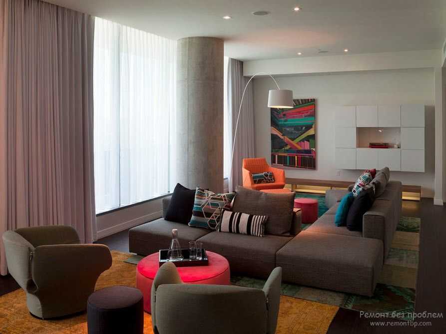 Поэтому важно обустроить ее именно так, чтобы Вы могли комфортно размещать максимальное количество человек. В случае, если помещение совсем маленькое, корпусная мебель поместится проблематично, поэтому поставить лучше пару мягких кресел или стандартный набор из дивана и одного или двух кресел и/или пуфика