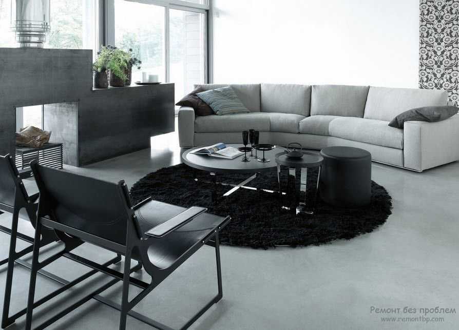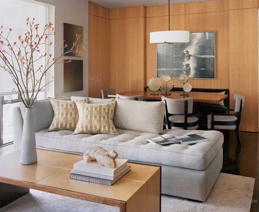 Простая аскетическая обстановка предъявляет жесткие требования. Здесь не должно быть высоких спинок у мягкой мебели, объемных мягких подлокотников и большого количества декоративных подушек.