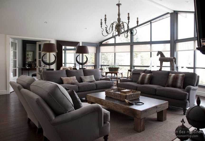 Сочетание серых и коричневых оттенков профессионалы именуют «палитрой доверия». Этот вариант позволяет создать уютное и гармоничное пространство. Особенно хорошо подобные сочетания работают в интерьерах с нотками роскоши, т. к. идеально сочетаются с богатой отделкой, но и в современном зале они будут уместны.