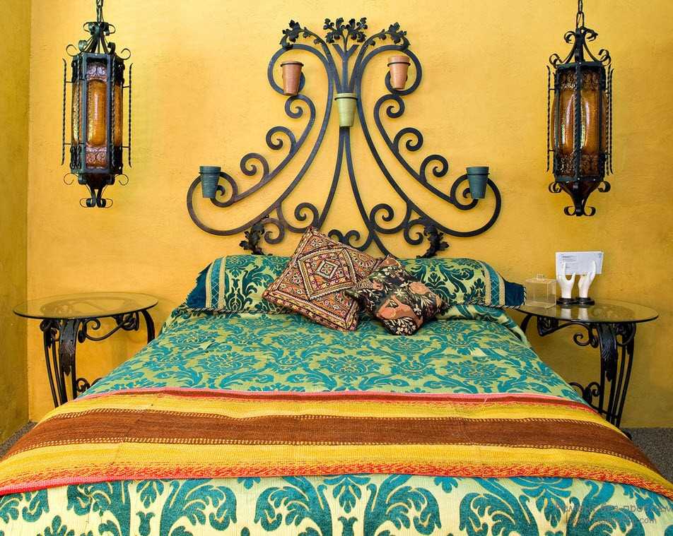 Спальня от гостиной отличается немногим. Это также комната для проведения отдыха, с обилием подушек, деревянных резных и металлических кованых элементов.