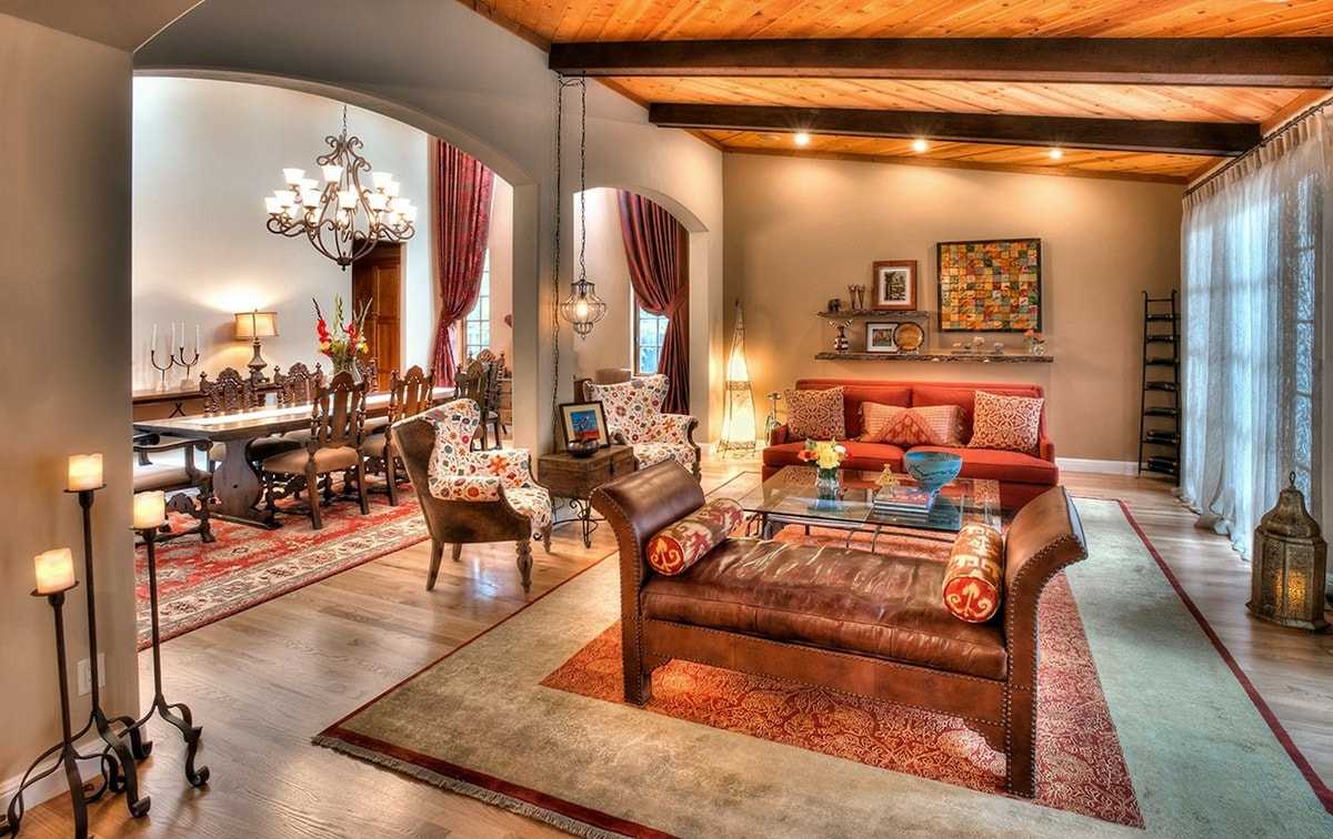 Всевозможные циновки, плетеные коврики или арабские ковры из шелка и шерсти придадут уют, особенно в вариантах, где для оформления пола были выбраны холодный гранит или керамическая плитка. Касаемо штор и различных занавесок здесь правильным будет сделать свой выбор в пользу плотной ткани грубой фактуры в сочетании с полупрозрачными гардинами.