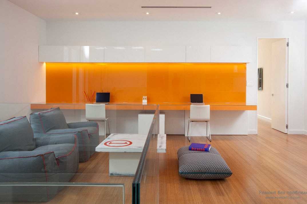 Яркий и глянцевый апельсин — отличный выбор для мест, где отсутствует естественная диффузия света. Где бы он ни был применен, оранжевый создает благоприятную среду, где вы можете работать и расслабляться.