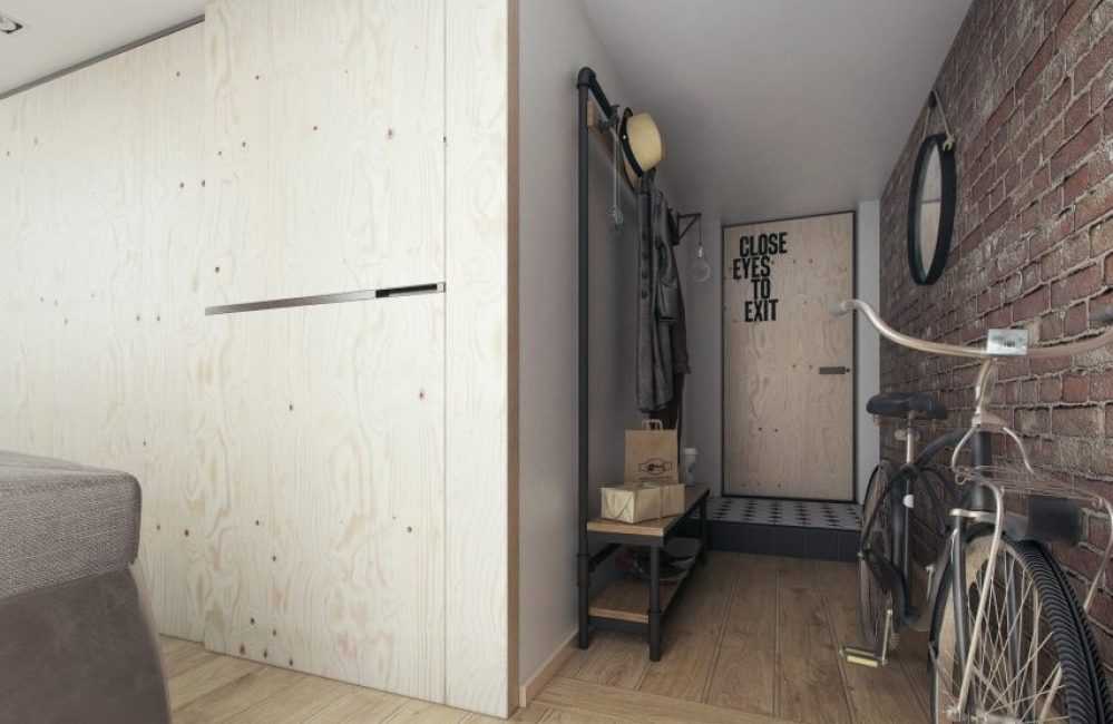 Прихожая должна быть выполнена в светлых оттенках. Стены комнаты не выравнивают, а оставляют фактурными. Их можно покрасить, если поверхность выложена из кирпича или облицевать плиткой, выполненной под кладку или бетон. Пол в прихожей может быть деревянным, наливным или покрытым ламинатом.