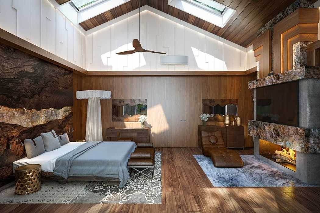 Крайне популярным приёмом дизайна спальни с высоким потолком является условное разделение комнаты на несколько уровней по горизонтали. Таким образом дизайнеры добиваются нейтрализации ощущения высоты. На уровне человеческого роста спальня имеет один тип отделки, а верхний уровень как бы отсекается за счёт упрощённого декорирования.