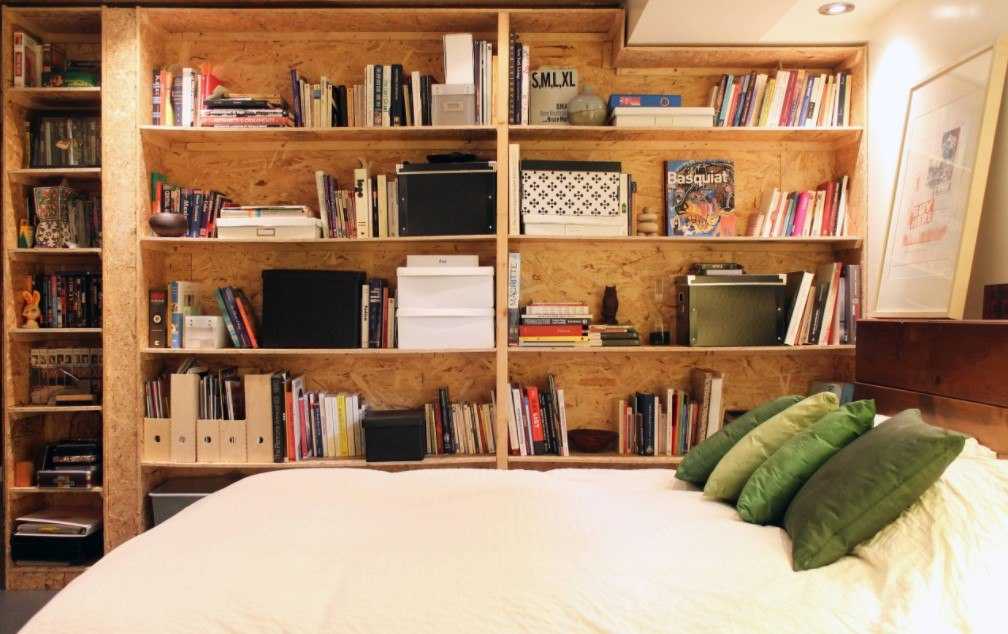 Обычно, стеллажи в спальню устанавливаются вокруг изголовья кровати, образуя букву «П». Существует горизонтальное и вертикальное размещение. Все зависит от размеров комнаты, высоты потолков и фантазии хозяина дома.