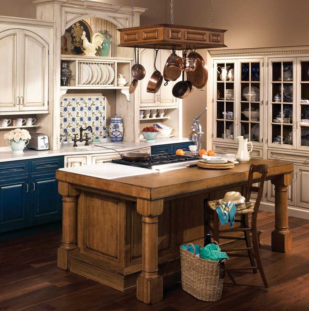 На кухне в стиле кантри больше всего хочется собраться всей семьей и поговорить «за жизнь» за чашечкой ароматного травяного чая со свежим печеньем. Здесь всегда уютно и тепло. Цветовая гамма светлая, сдержанная, даже немного монохромная. Акценты расставляются точечно на салфетках, посуде, шторах и прочих мелочах. На стенах камень, краска или штукатурка; на полу дерево, камень или керамогранит. Сам гарнитур состоит из деревянного массива, более доступный вариант – ДСП.
