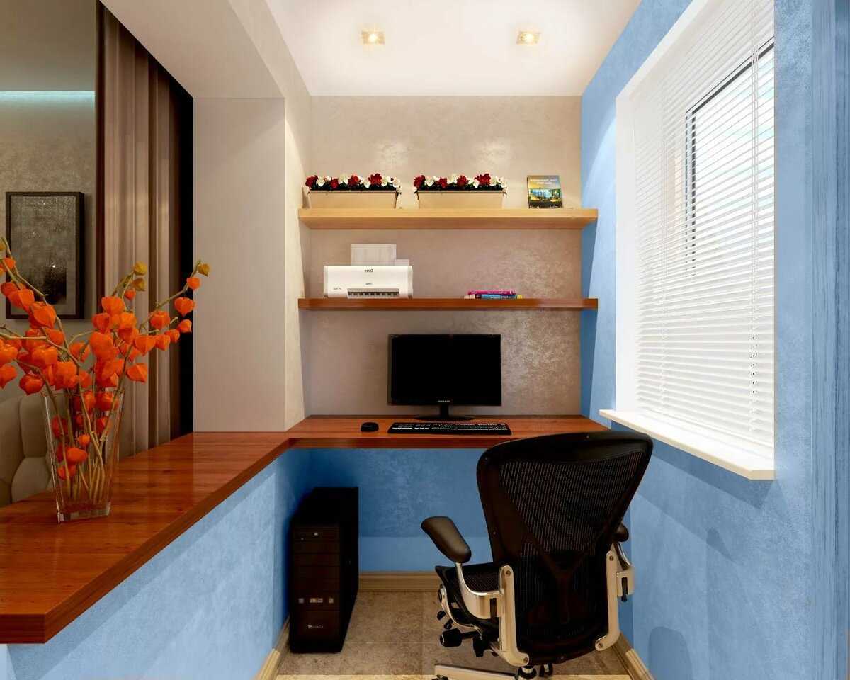 - Дизайн офисного варианта выполняется в классическом стиле. Удобное кресло, маленький компьютерный стол, полки для книг – все это можно удачно разместить в таком помещении. В качестве отделочного материала лучше использовать натуральное дерево, покрытое лаком строгих тонов. Такая мебель будет смотреться весьма респектабельно;