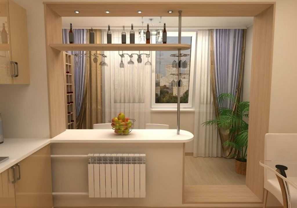 Обеденную зону желательно частично или полностью вынести на лоджию, это значительно освободит пространство. На лоджии можно расположить холодильник или часть кухонного гарнитура. Отличным дизайнерским решением стал подоконник между лоджией и кухней, его можно переделать в модную барную стойку.