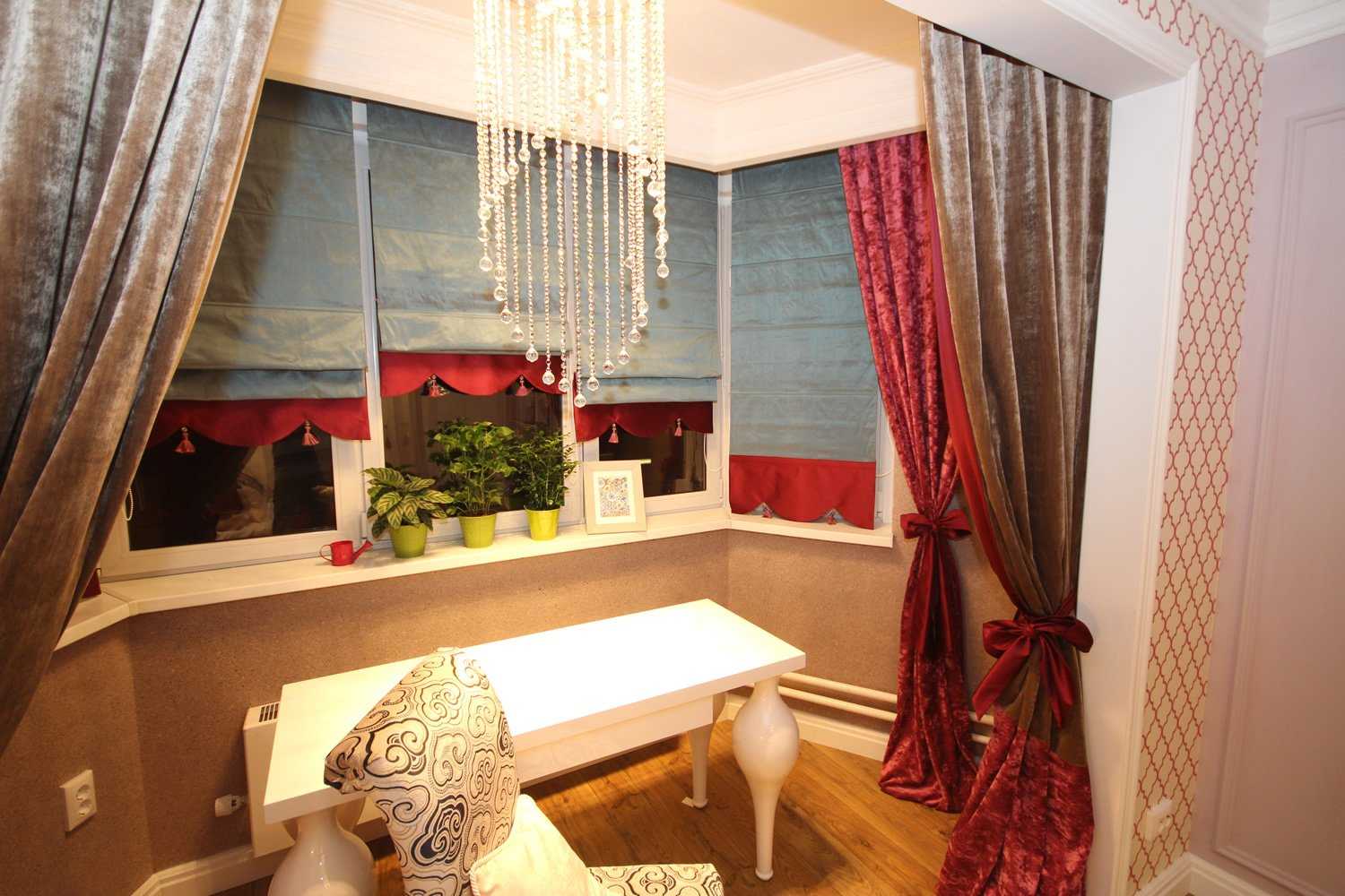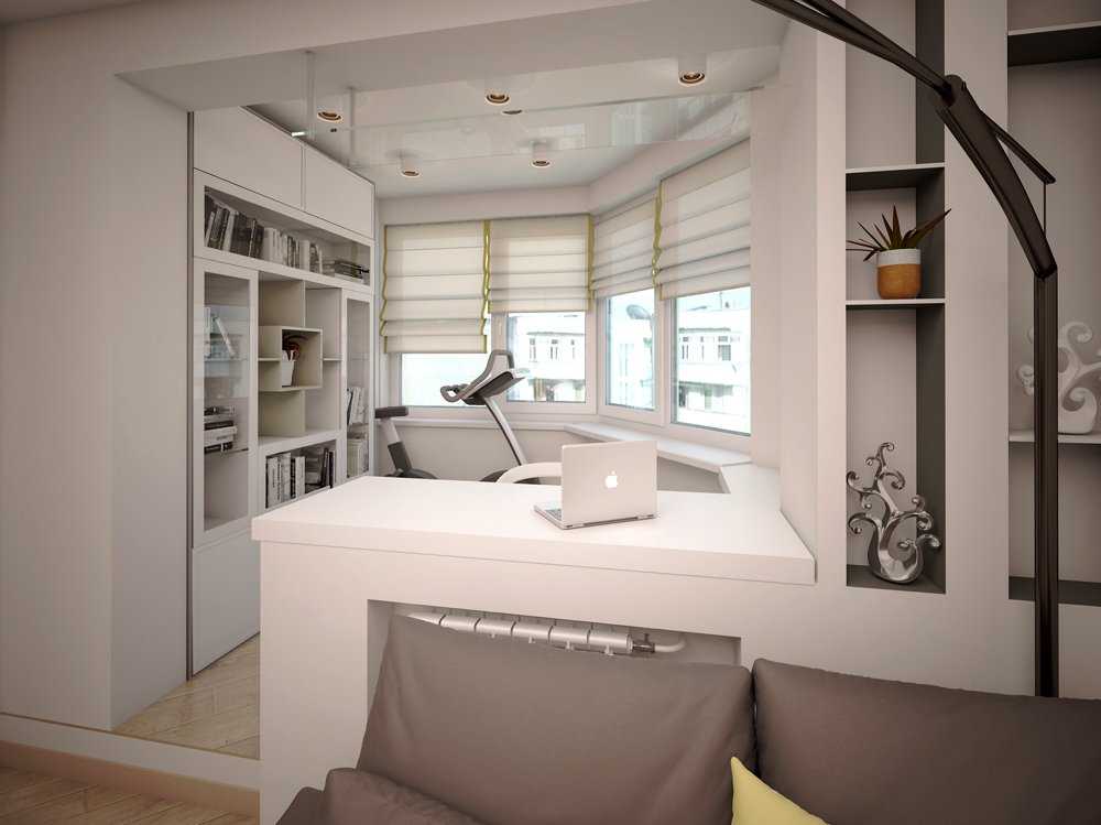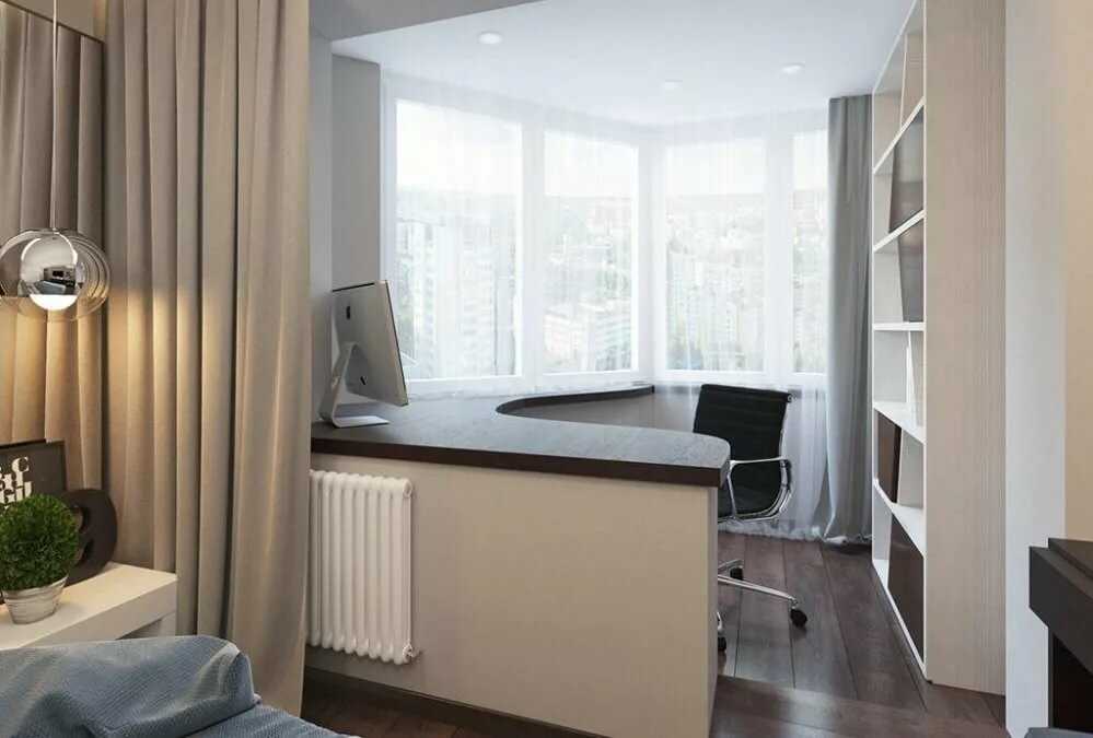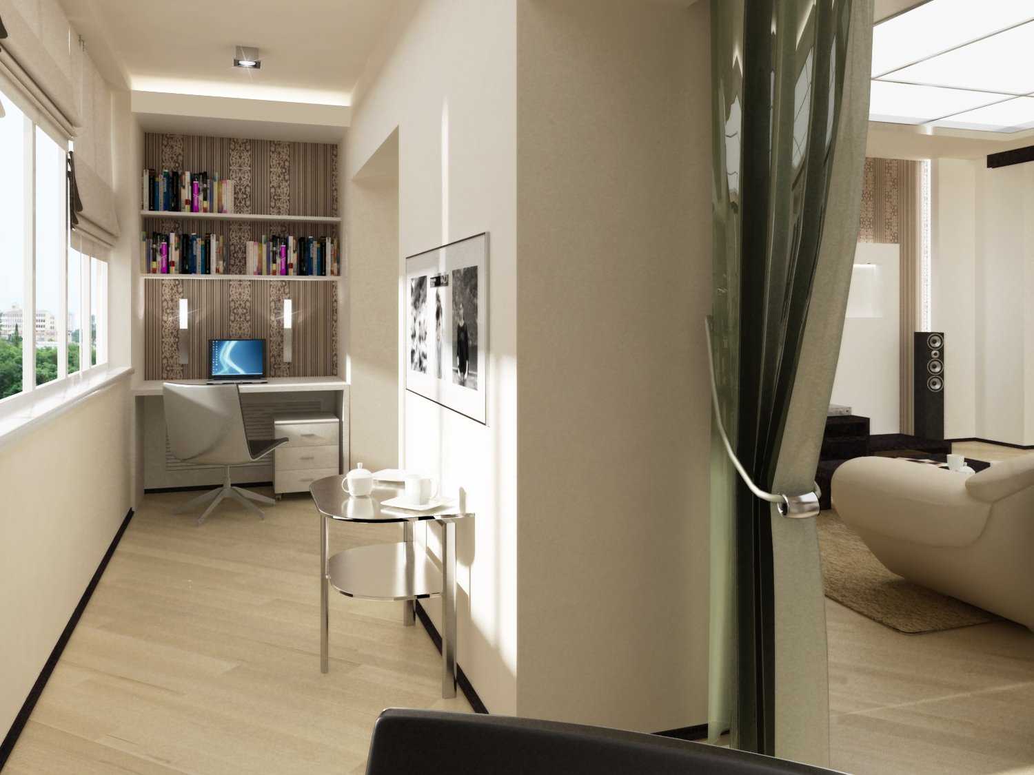 Кухня с зоной отдыха или кабинетом. Объединенную с лоджией кухню можно использовать не только по ее прямому назначению, но и воплощать в реальность оригинальные задумки. Например, здесь можно расположить зимний сад или же мини-бар. Оригинальной идеей будет создание детской площадки, чтобы ребенок был всегда под присмотром матери или же установка личного кабинета. Если эта идея оказалась интересной, и она будет воплощаться в жизнь, то для визуального разделения и создания отдельных зон лучше всего использовать ширмы или «французское окно». Среди альтернативных вариантов можно отметить завесы и оригинальные стеллажи, что будут не только служить перегородкой, но и носить функциональную роль.