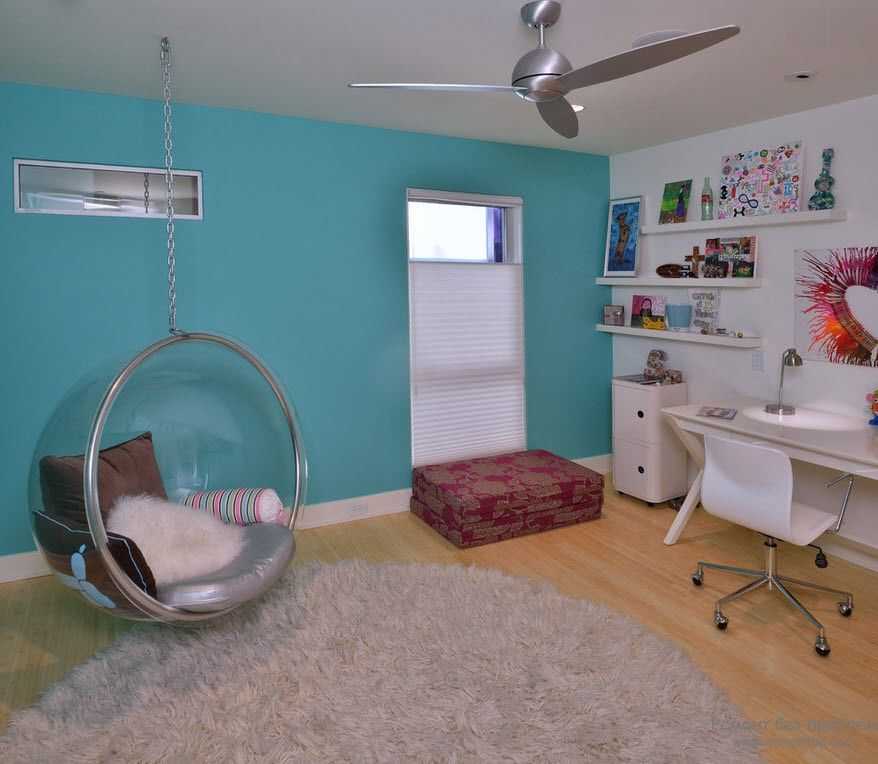 Очень оригинально и молодёжно смотрится подвесное кресло, оно может быть из пластика, дерева или стекла. Сидеть в нем, особенно на мягкой подушке, будет сплошным удовольствием.