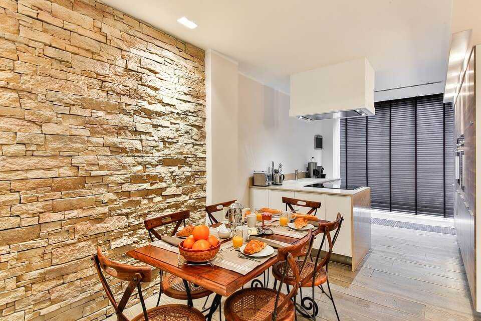 - комбинирование фактур (камня, покраски, обоев, каменных и деревянных вставок).
