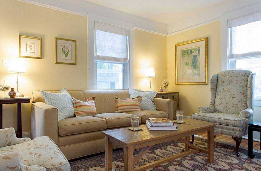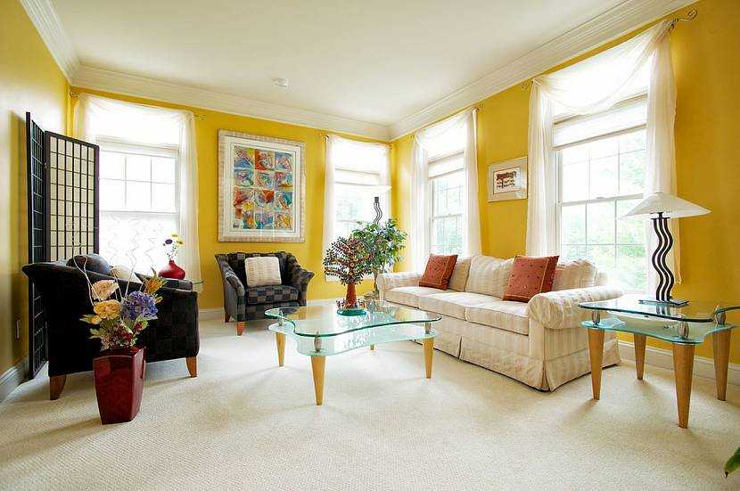 Если зал расположен на северной стороне, то цвет сделает комнату солнечной. Правильно подобранный тон из палитры привнесет в гостиную ощущение движения, энергии и жизнерадостности. Чтобы желтый не утомлял, дизайнеры используют приглушенные оттенки (ваниль, воск, прозрачная пастель). Гамму комбинируют с белым, серым или коричневым на потолке, в мебели.