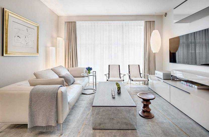 Светлая палитра цвета отличается сдержанностью, элегантностью и строгостью. В современных интерьерах уместно использование вариантов с металлическим блеском, в классических – с бархатистым эффектом. Ахроматические оттенки создают дизайн гостиной без эмоций. Чтобы помещение не выглядело унылым, нужны правильные переходы. Серый гармонично сочетается со всеми тонами, выступая в роли тени. Если комната маленькая, то в деталях лучше использовать светлые варианты (белый, бежевый).