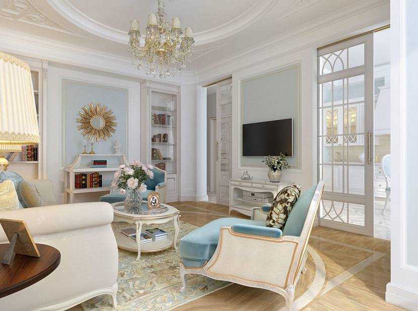 Белый ламинат в интерьере гостиной будет смотреться эффектно и зрительно сделает зал больше. Узор и текстура дерева на полу, отделка стен сдержанного цвета и предметы мебели плавных форм будут лаконично сочетаться в классическом интерьере, образуя единую картину.