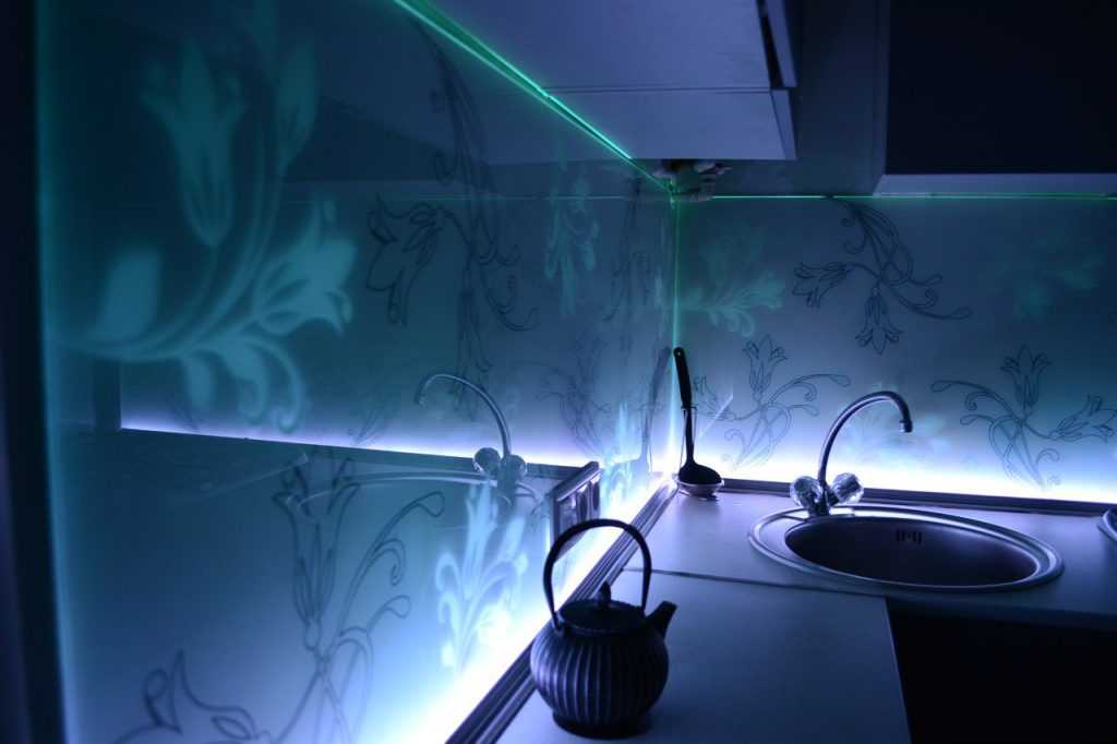 Светлый красивый интерьер кухни с оригинальной светодиодной подсветкой на мебели