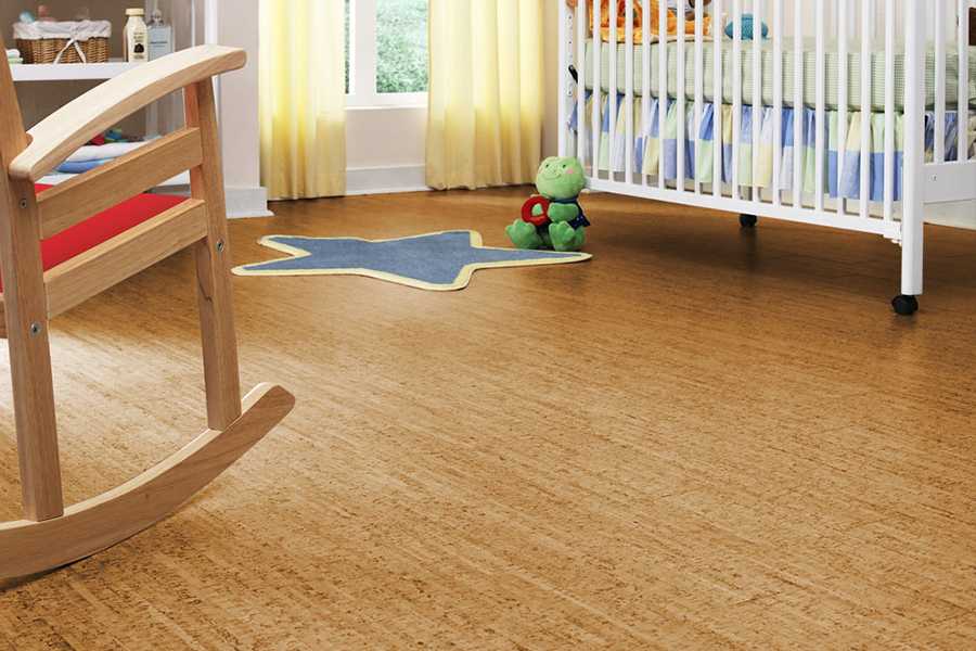 Пробку можно считать идеальным вариантом для детской: она экологичная, безопасная, мягкая, упругая. Из минусов разве что низкая устойчивость к повреждениям острыми предметами — даже кубик LEGO может стать причиной порчи напольного покрытия.