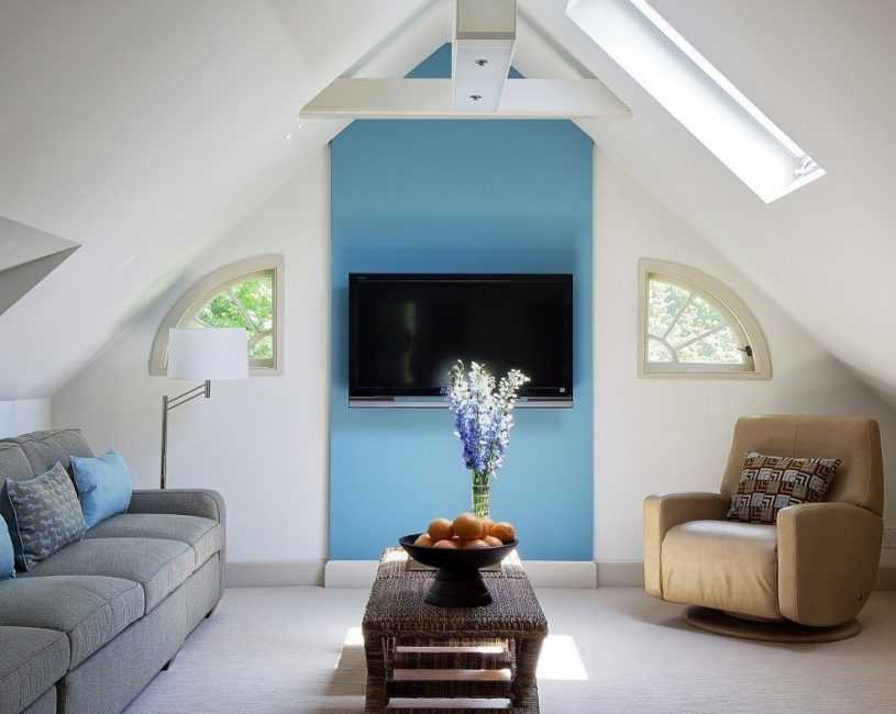 В небольшой по размерам комнате рекомендуются светлые тона в сочетании с рисунком. Они визуально увеличивают пространство и одновременно не отвлекают от просмотра любимых телепередач.