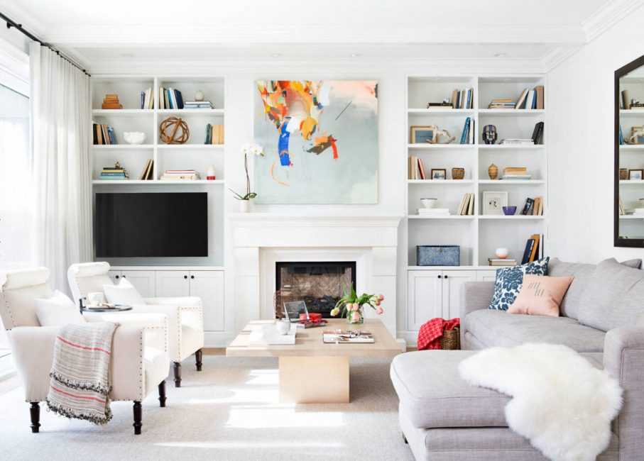 Особенно тщательно подойдите к дизайну стены с камином и телевизором. Данная поверхность должна быть выполнена сдержанно в мягких тонах. Богатый декор будет создавать перегруженность и быстро утомлять.