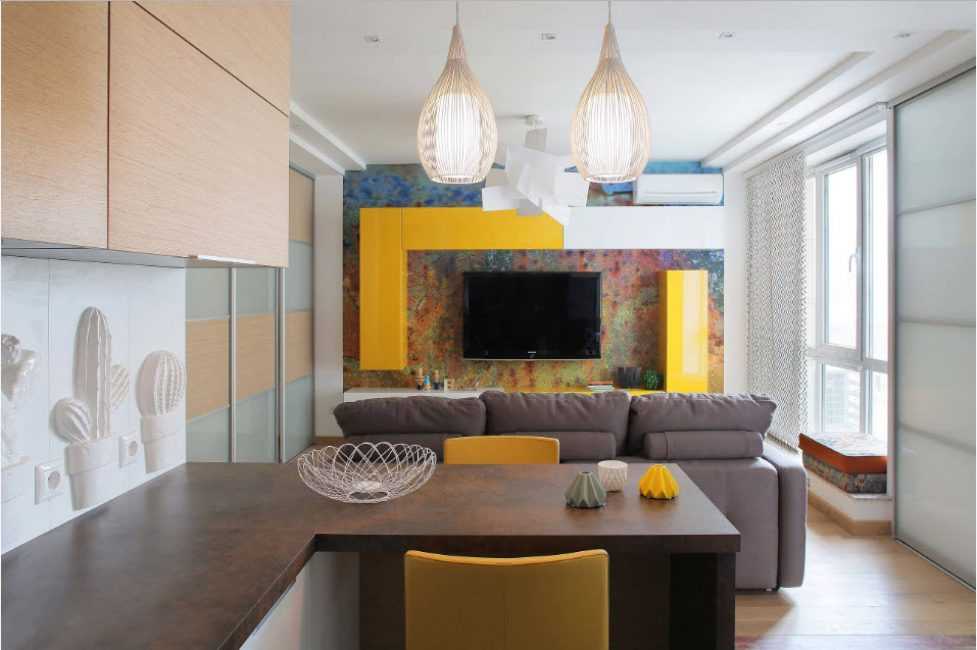 В результате объединения комнат мы получим пространство с двумя окнами, а значит, здесь будет больше света и воздуха. Появится и зона столовой. Чтобы правильно подобрать для нее обеденный стол, рассчитывайте на человека, как минимум, по 70 см. Когда на полноценный стол не хватает места, на помощь придут варианты со складным столом-трансформером или барной стойкой. Кстати, последняя может визуально разделять зоны кухни и гостиной.