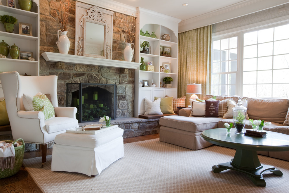 Стиль рустик, прованс, кантри в оформлении гостиной подчеркнет небольшой или средний камин с Д-образным порталом. Основная цель этого направления – создание комфортной обстановки в сочетании с функциональной естественностью. Пристенный, угловой или заглубленный очаг оформляют необработанным деревом, песчаником, ракушечником. Для облегчения работ используют фальш-панели, имитирующие природные материалы.